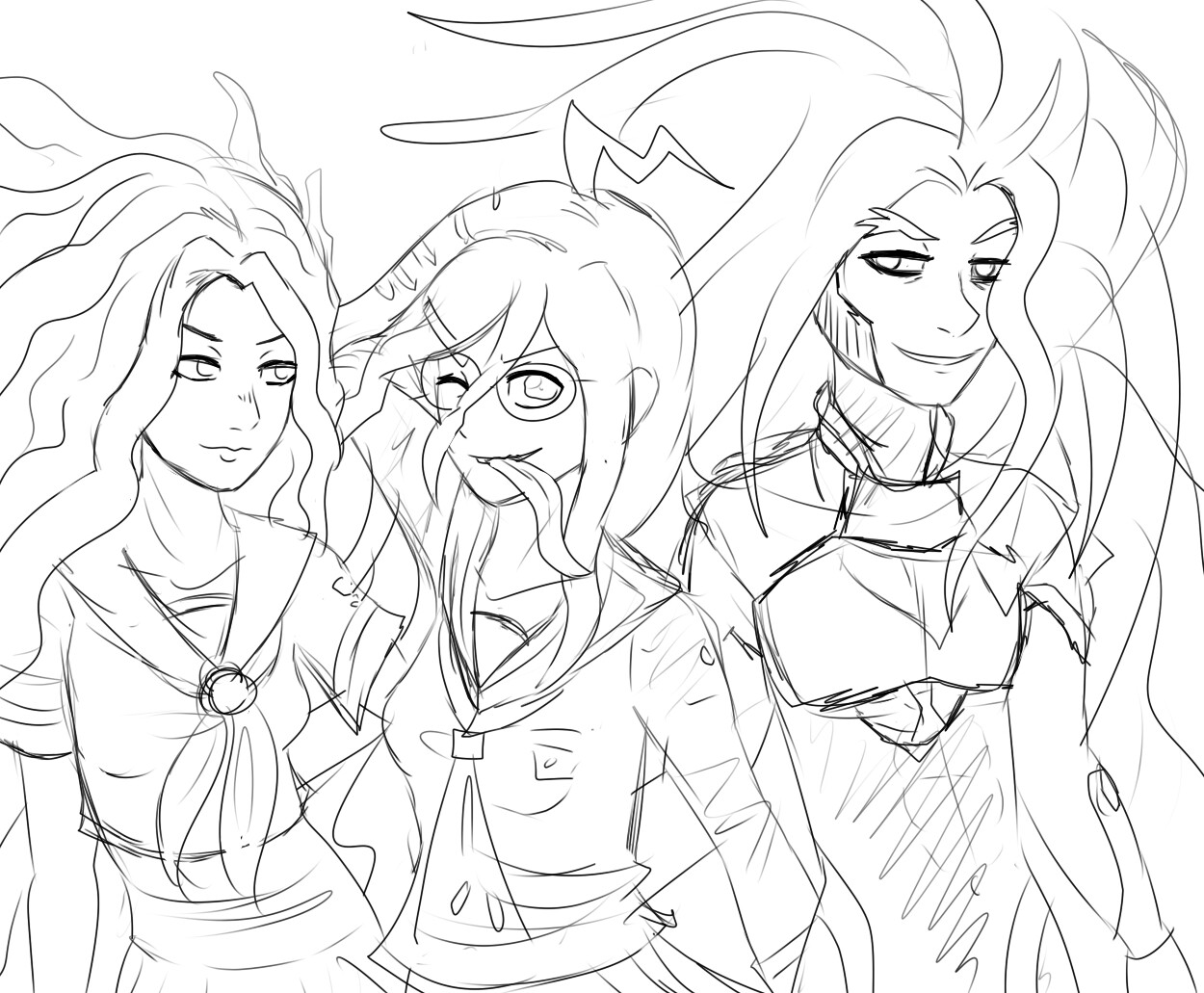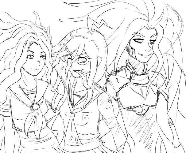 A quick messy sketch of Genocider Syo (or Genocide Jack, as she’s known in the english localization) from Danganronpa, Yukako Yamagishi from Jojo’s Bizarre Adventure Part 4, and Id from Xenogears all hanging out xD I was still trying to figure out how to draw Id’s outfit & hair back then, lol.